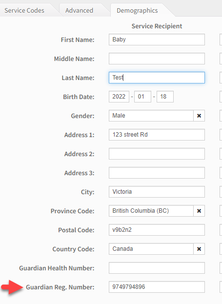 For in-province claims the mother's PHN will need to go in the Guardian Registration Number field for the claim. You can add this directly to the baby's patient record OR if you already have the mother's PHN in ClinicAid you can just leave the baby's patient record void of a PHN and add it into the bill manually in the advanced tab of the invoice.