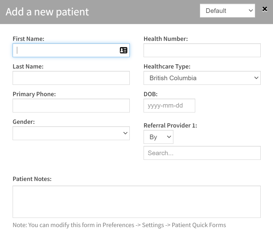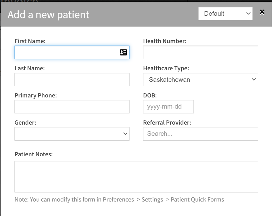 ClinicAid is set up with default settings for patient creation. You can set up your patient creation forms to fit your workflow.