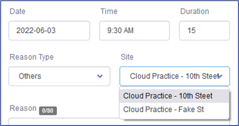 When booking an appointment, your staff will now be able to select which location is the appointment scheduled at using the ‘Site’ drop down.