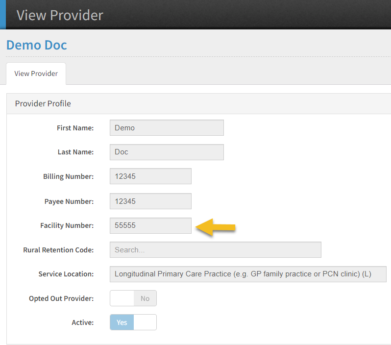 You can update your Provider Record, by entering it in the "Facility Number" Field as shown below.