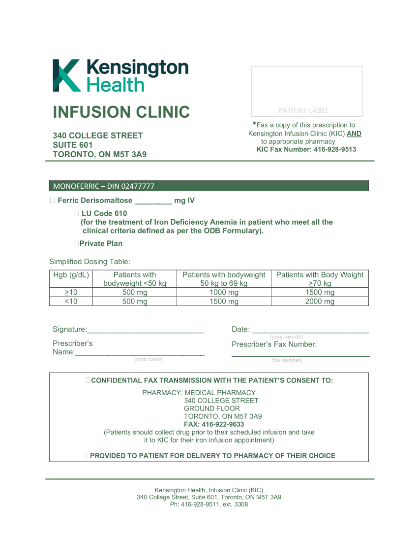 Monoferric Order Form - Kensington Health Infusion Clinic Print