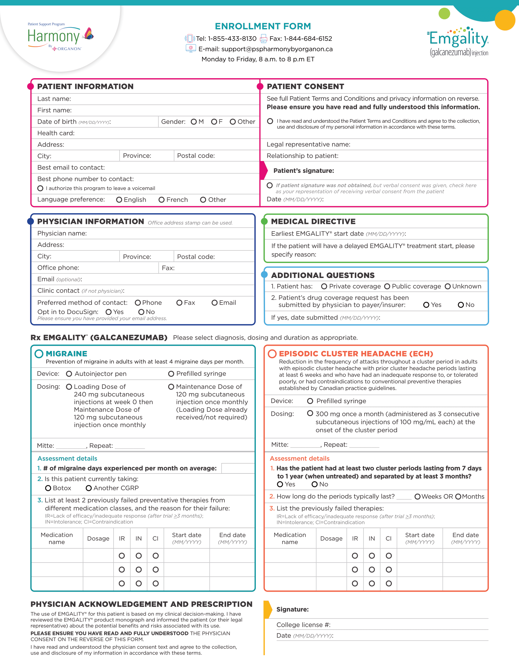 Emgality (galcanezumab) PSP Enrollment Form Harmony by Organon 2025 Print