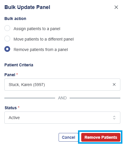 Aside from removing patients from a panel individually, users can use the Bulk Update option to remove all patients from a panel.