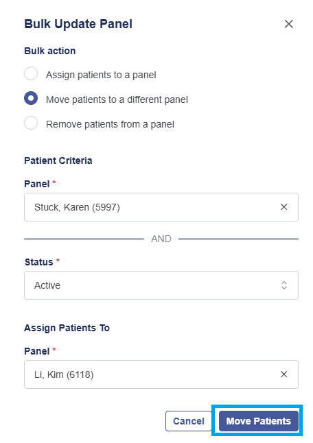 In rare cases, clinics may need to move all patients from one panel to another. Instead of doing this individually, the Bulk Update function can be used.