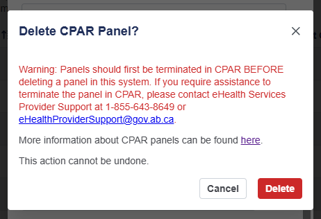 Panels can be deleted by users. Note that clinics must contact the eHealth Services Provider Support Team to fully disable the panel.